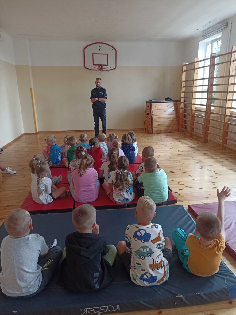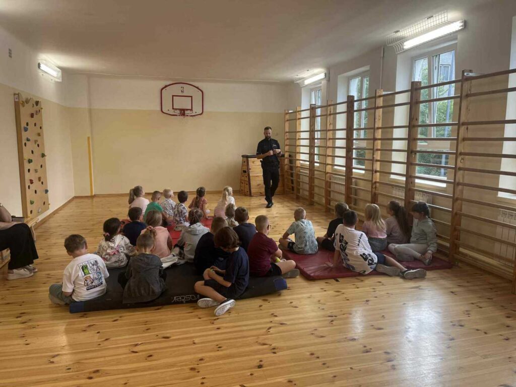 z Policją. Podczas cyklu edukacyjnego policjanci przypomnieli dzieciom między innymi jakich zasad należy przestrzegać, aby bezpiecznie dotrzeć do szkoły oraz jak ważne są elementy odblaskowe dla pieszego. Mundurowi przypomnieli także o numerach alarmowych, z których należy korzystać