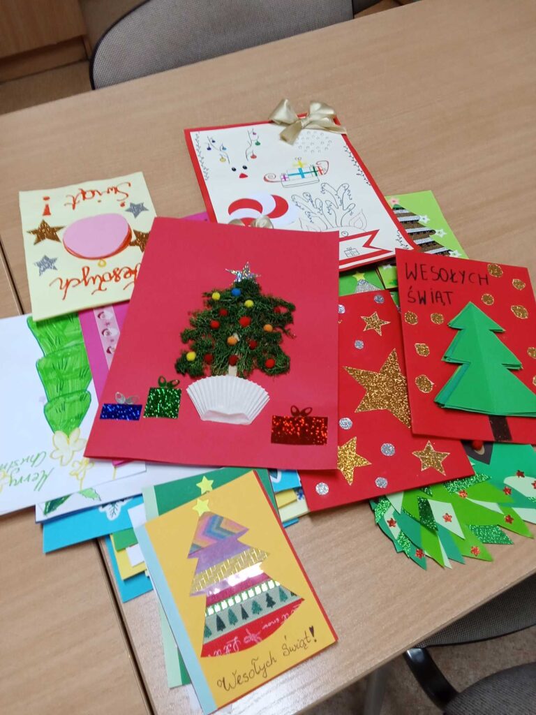 W czasie przedświątecznych przygotowań pamiętamy o tych, którzy czekają na odrobinę miłości. Uczniowie naszej szkoły przygotowali karty świąteczne ,,Moc życzeń. Boże Narodzenie.” Słowa miłości, pamięci i nadziei trafiły do podopiecznych Domu Opieki Społecznej w Starych Lipkach, Domu Opieki Leśna Góra w Kamieńczyku, a także do Domu Dziecka Pod Kasztanami w Siedlcach.